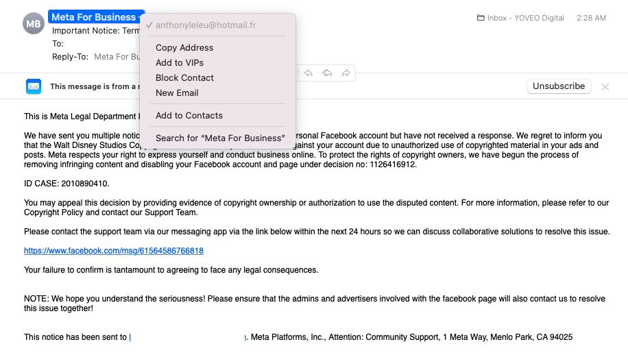 Attention, Meta Business Managers! Scammers are on the prowl, sending phishing emails disguised as official communications from the Meta for Business Legal Department. These emails typically claim your Facebook page is in violation of copyrighted material from a major company like Walt Disney Studios, and threaten to disable your page if you don’t take immediate action.